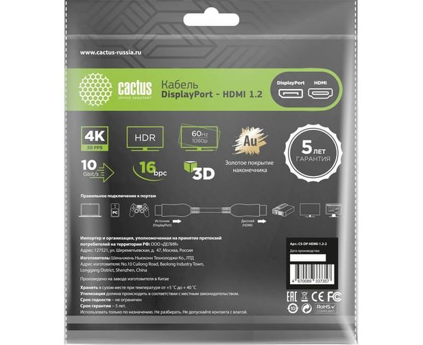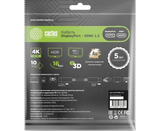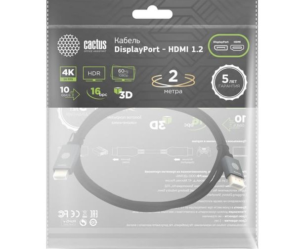 Кабель аудио-видео Cactus CS-DP-HDMI-1.2-2 DisplayPort(m)/HDMI(m) 2м позолоч.конт. черный