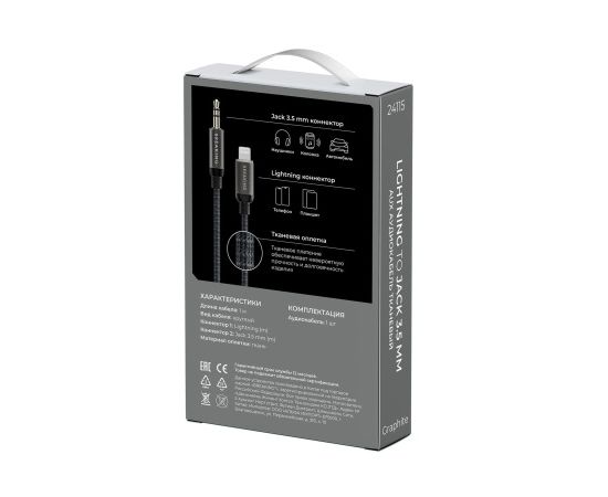 Кабель AUX Breaking Graphite, Lightning - AUX, соединяющий разъем Lightning с аудиовыходом формата AUX, предназначен для подключения совместимых мобильных устройств (например, iPhone) к автомобильной акустике, домашним стереосистемам или другим устройствам с входом AUX.
