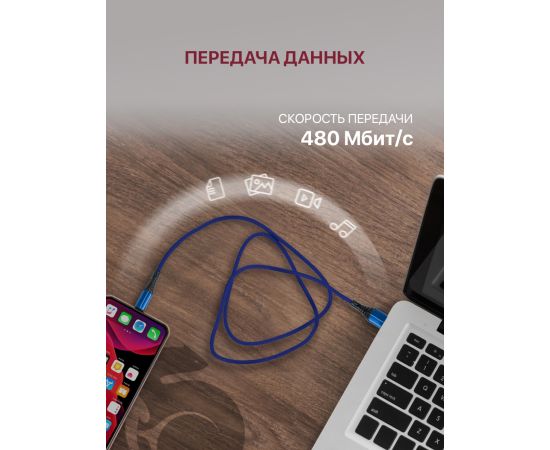 Кабель Type-C-USB для быстрой зарядки и передачи данных (2.1A) нейлоновый, синий (1м)