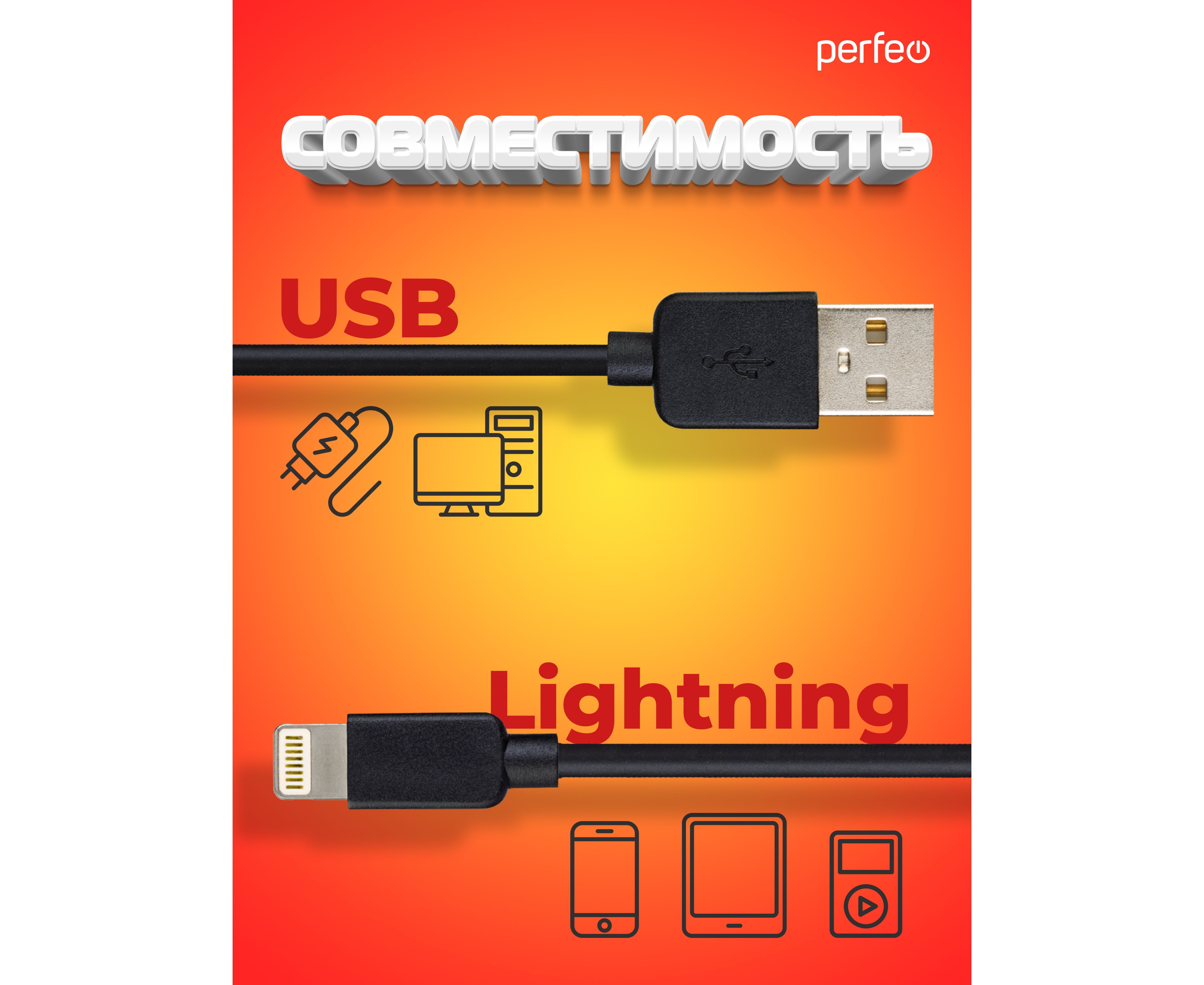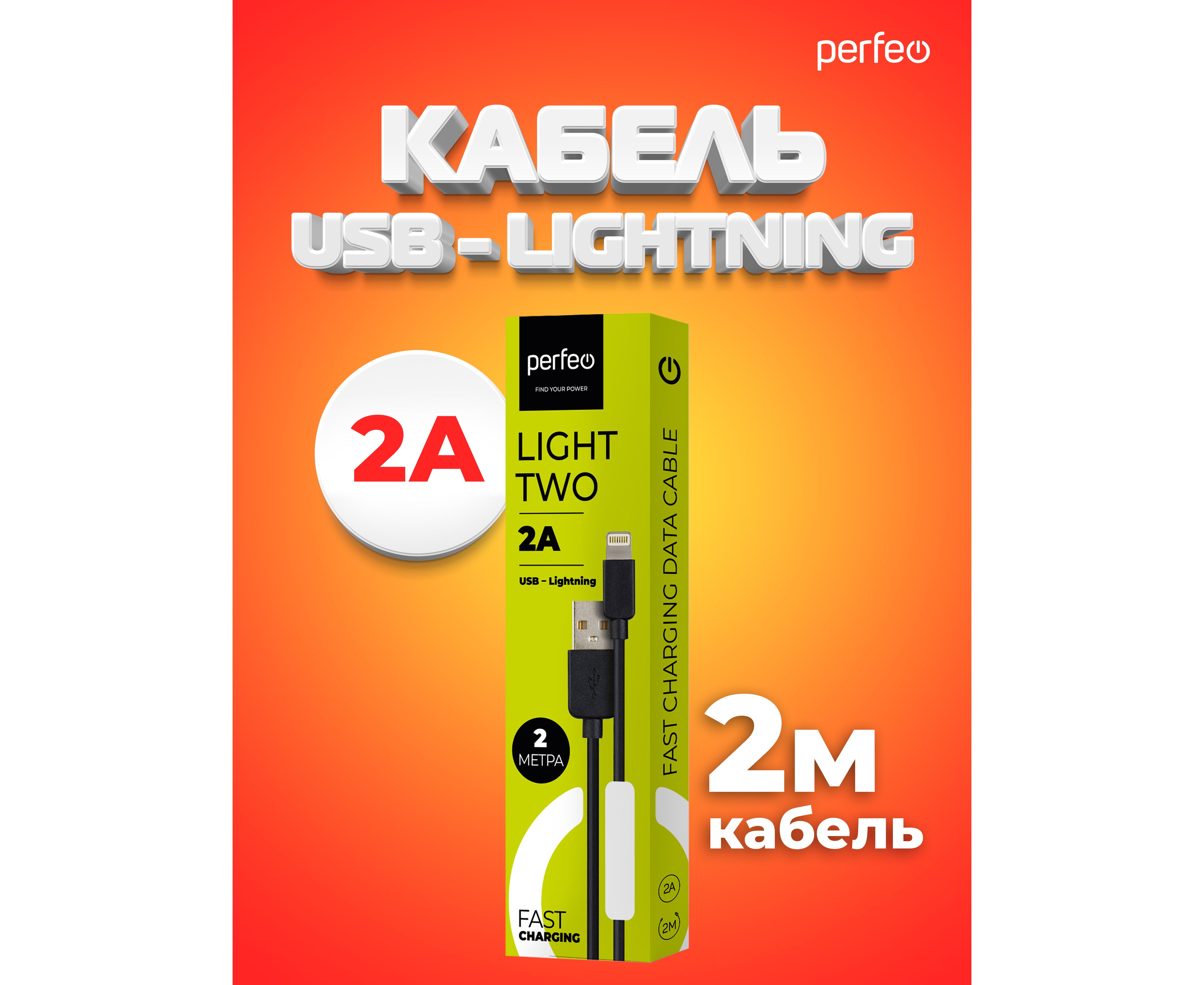 Кабель PERFEO USB A вилка - Lightning вилка, 2A, черный, длина 2 м., TWO (I4321)