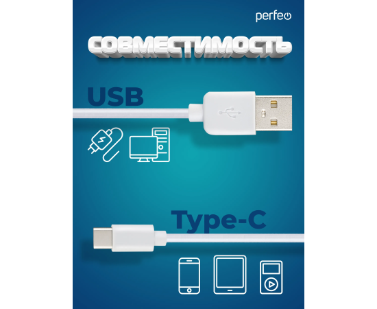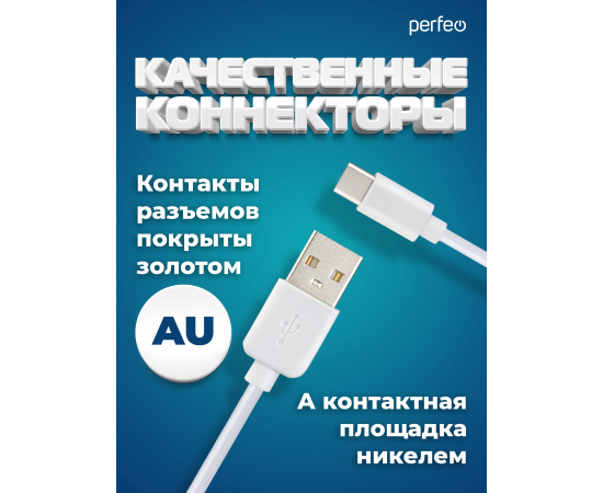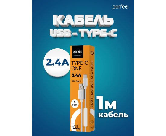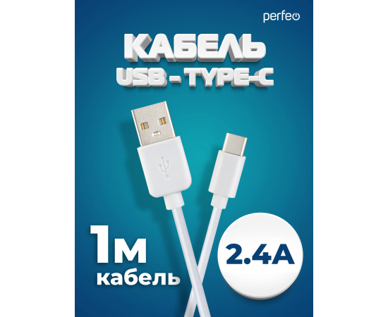 Кабель PERFEO USB A вилка - Type-C вилка, 2.4A, белый, длина 1 м., Type-C ONE (U4704)