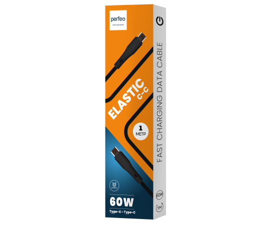 Кабель PERFEO USB C вилка - C вилка, 60W, черный, силикон, длина 1 м., ELASTIC (C1107)
