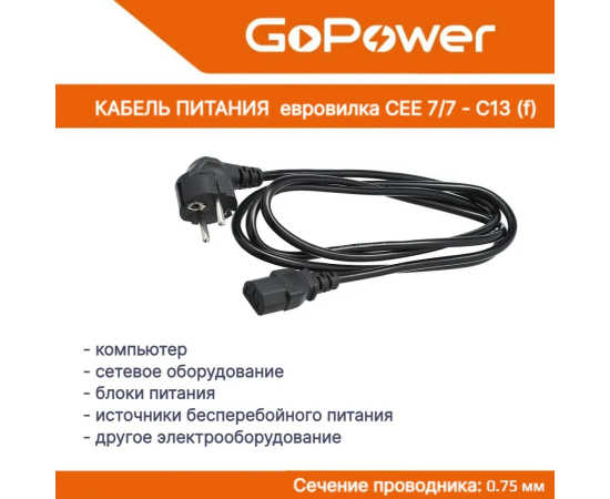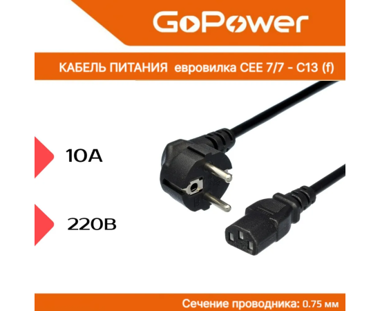 Кабель питания GoPower 00-00024054 евровилка CEE 7/7-C13 1.8м ПВХ 0.75мм черный 1/10/160