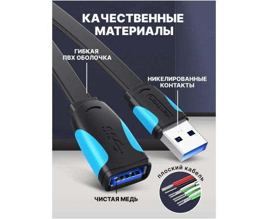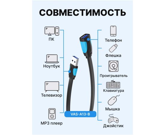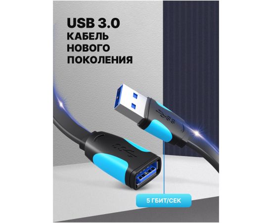 Кабель удлинитель Vention VAS-A13-B050 USB 3.0 AM/AF 0.5м плоский