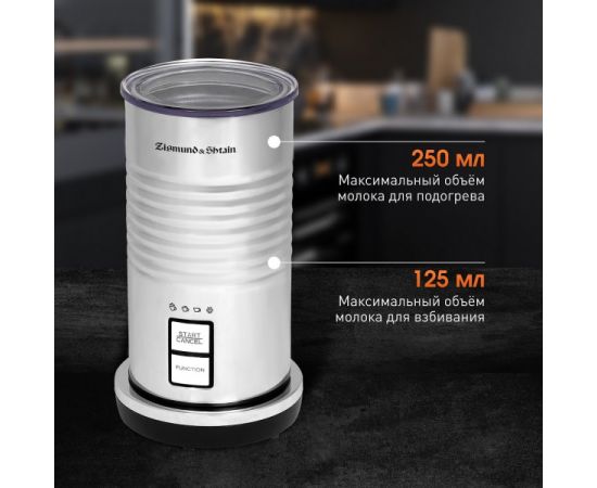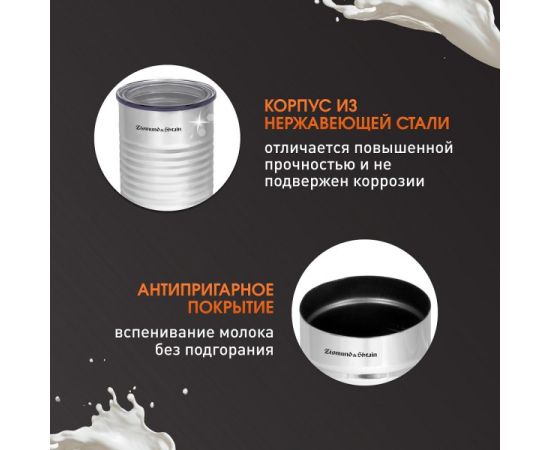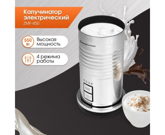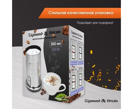 лектрический капучинатор Zigmund & Shtain ZMF-450 предназначен для вспенивания и нагревания молока. Капучинатор обладает высокой мощностью 550 Вт и с легкостью приготовит стойкую пенку для любимых кофейных напитков латте, макиато, капучино, а также коктейлей на основе молока. Достаточно всего лишь налить немного молока, закрыть крышку и выбрать один из режимов.