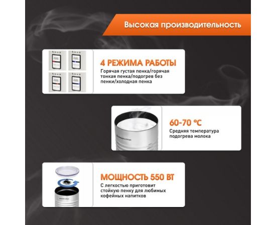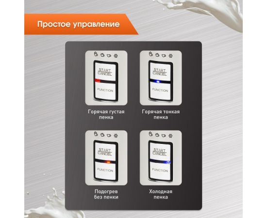 • Выбор режима – горячая густая пенка/горячая тонкая пенка/подогрев без пенки/холодная пенка