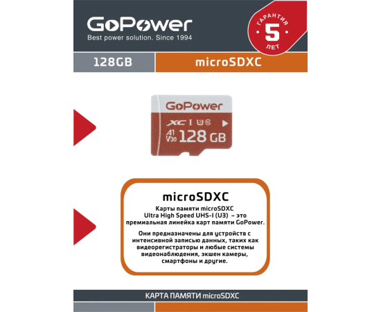 Карта памяти GoPower 00-00025683 microSD 128GB Class10 UHS-I (U3) 100 МБ/сек V30 без адаптера
