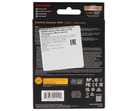 Карта памяти SanDisk Extreme Pro SDXC 64 ГБ [SDSDXEP-064G-GN4IN] обладает скоростью записи до 100 Мбайт/сек и чтения до 280 Мбайт/сек. Классы UHS Class 3 и Video Class 60 подходят для записи видео формата до 4к. SanDisk Extreme Pro SDXC 64 ГБ [SDSDXEP-064G-GN4IN] имеет объем 64 ГБ. Устройство защищено от рентгеновских лучей, от внешнего воздействия и водонепроницаемо.