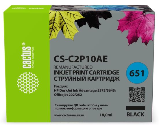 Картридж струйный Cactus CS-C2P10AE № 651 черный (18мл) для HP 5575/5645;Officejet 202/252