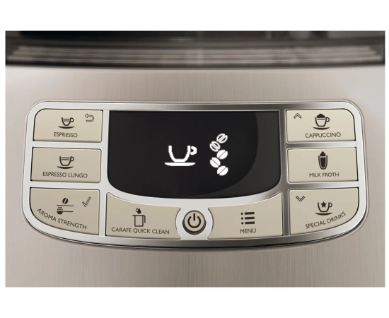 регулируемый по высоте диспенсер; энергосберегающий режим; контейнер для отработанного кофе на 10 порций; 10 степеней помола