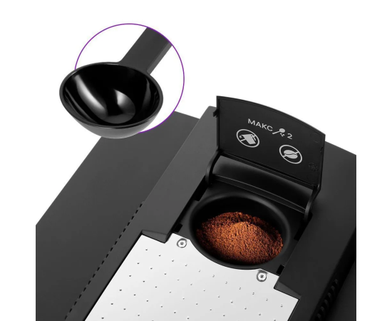 Помимо кофемолки, кофемашина КТ-7320 имеет ёмкость для молотого кофе. А для точности граммовки можете использовать специальную мерную ложечку, идущую в комплекте.