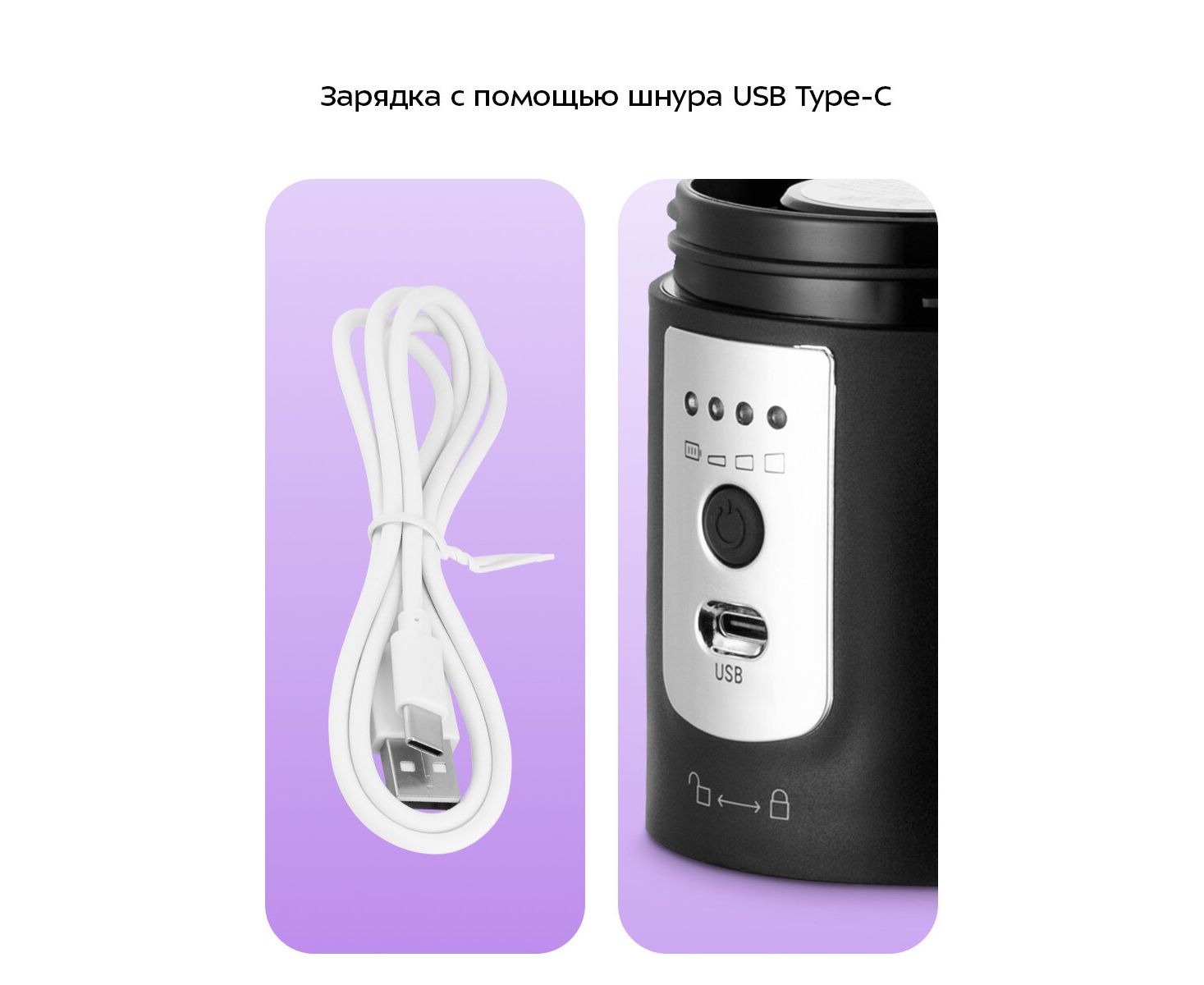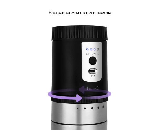 Устройство работает от встроенного аккумулятора. Зарядка кофемолки осуществляется с помощью шнура USB Type-C, который идёт в комплекте.