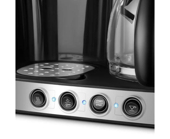На панели расположены 4 кнопки. Кнопка «Нагрев» включает нагрев рожковой кофеварки, а «Кофе» приготовление в капельной. Кнопка «Пар/Эспрессо» переключает на приготовление эспрессо или пара. «Старт/Стоп» запускает и останавливает приготовление эспрессо.