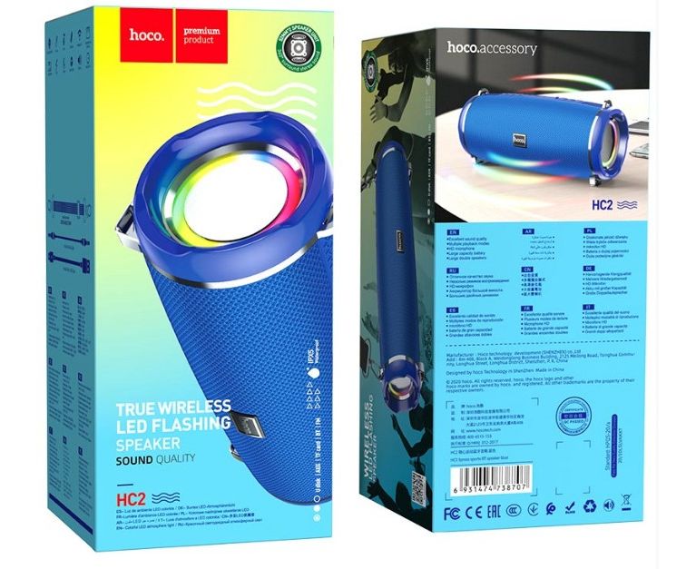 Колонка с поддержкой Bluetooth V5.0 Hoco HC2 Xpress включает в себя 2 динамика диаметром 52 мм и мощностью 5 Вт каждый, работает от аккумулятора емкостью 2400 мАч. Время работы - до 6 часов, зарядки - до 3 часов. Поддерживает режим FM-радио, проигрывание с карты памяти, есть разъем AUX 3.5mm. Размеры 194,4 х 81 х 82 мм, вес: 598 г. Пластиковый корпус покрыт тканью, динамик окружен светодиодным кольцом, к колонке можно присоединить ремешок для переноски. Колонка представлена в пяти цветах - черный, синий, зеленый, зеленый камуфляж, красный.