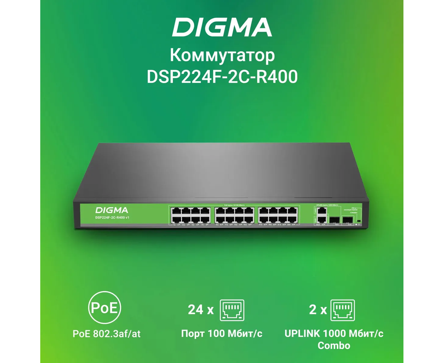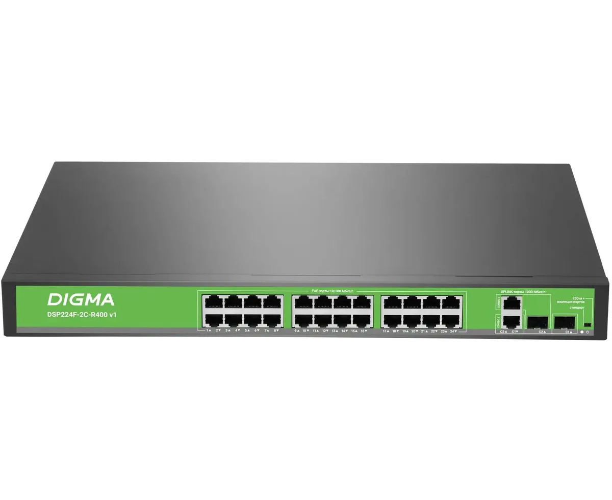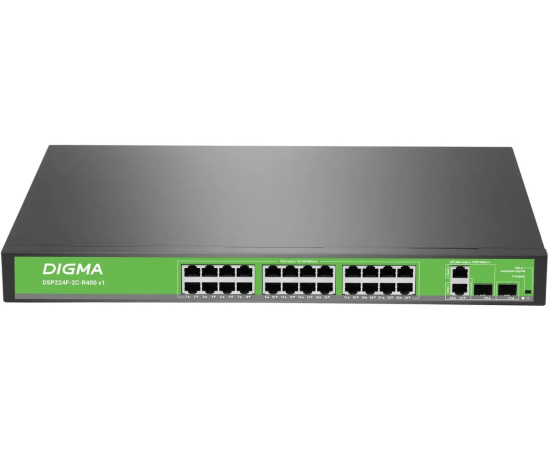 Коммутатор неуправляемый Digma DSP224F-2C-R400 V1 (L2) 24x100Мбит/с 2xКомбо (1000BASE-T/SFP) 24PoE 24PoE+ 400W