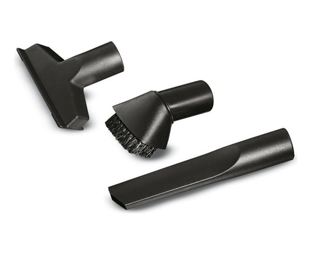 Комплект насадок, состоящий из щелевой насадки, насадки для мягкой мебели и щеточной насадки. Подходит ко всем пылесосам Kärcher для сухой или влажной и сухой уборки с номинальным диаметром принадлежностей DN 35.