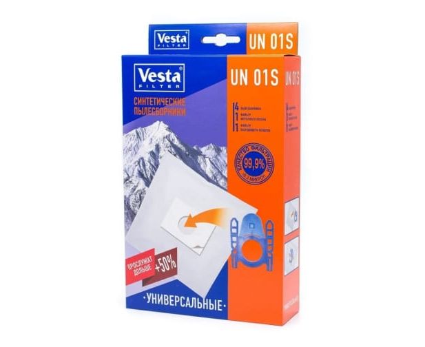 Мешки для пылесосов Vesta filter UN01S для ЛЮБЫХ бытовых пылесосов. Мешки с клейкой основой , используются в случае наличия рамки от оригинального мешка, которую потребуется приклеить на мешок из набора UN 01 S. Произведены из синтетического микроволокна, обладают высокоэффективным качеством фильтрации в 99.9 % (0.3 микрон), обеспечивают очистку воздуха выходящего из пылесоса. Благодаря синтетическому материалу мешки VESTA FILTER UN 01S не боятся воды и острых предметов, сохраняют мощность пылесоса при заполнении, вмещают в себя больше содержимого чем мешки из бумаги. В комплектацию входят 4 пылесборника , 1 фильтр моторного отсека и 1 фильтр выходящего воздуха.