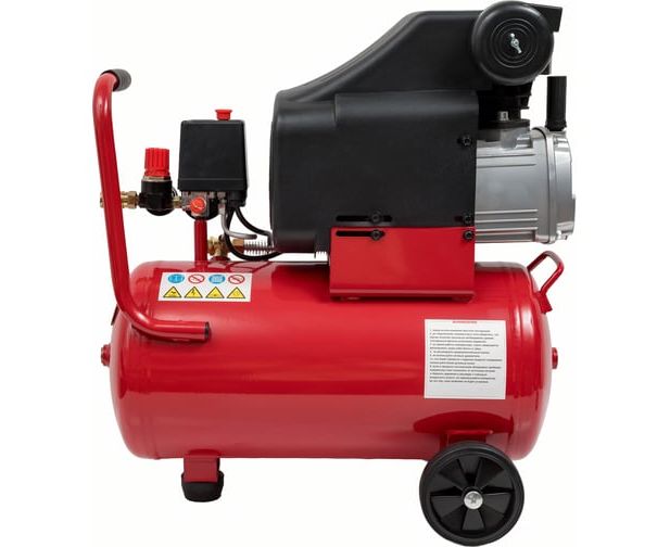 Мощность компрессора составляет 1.5 кВт, что соответствует 2.2 лошадиным силам, обеспечивая стабильную работу. Объем ресивера в 24 литра позволяет поддерживать постоянный поток воздуха, а наличие транспортировочных колес облегчает перемещение устройства.