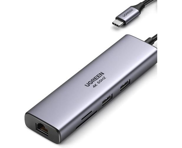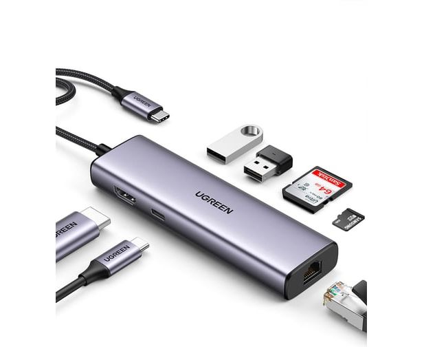 Конвертер UGREEN CM512 (90568) USB-C to 2*USB3.0+HDMI+RJ45+SD TF +PD Port Converter серый