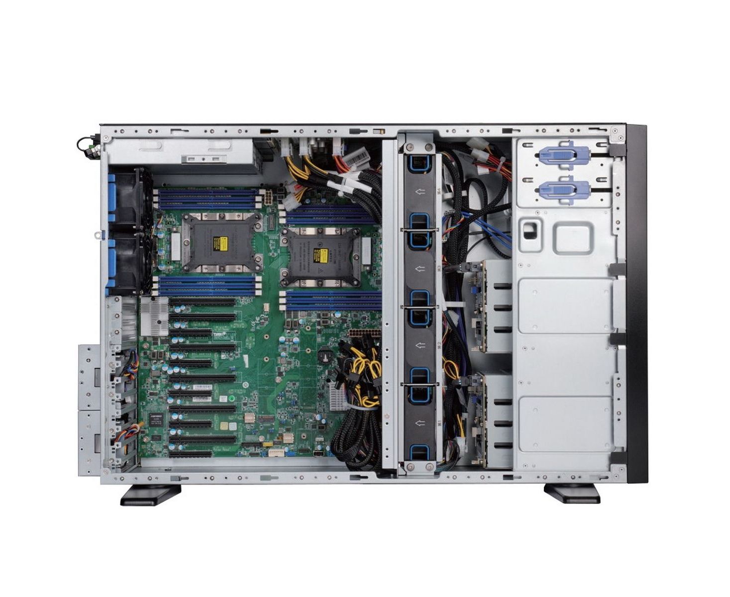 Установка до 4х 2-слотовых GPU. 4 предустановленных средних (Middle) вентилятора HotSwap 80mm PWM 11000rpm. 4-портовый Backplane 12Gb/s Mini-SAS HD. Предустановленная плата распределения питания (PDB). Возможность установки в серверный шкаф (крепеж приобретается отдельно).
