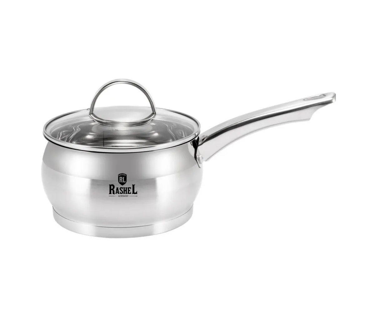 Ковш кухонный 2,1л из серии Катрин ТМ Rashel выполнен из экологичной высококачественной нержавеющей стали 18/10, устойчивой к коррозии. В комплекте стеклянная жаропрочная термостойкая крышка, которая имеет отверстие для отвода пара и удобная металлическая ручка.