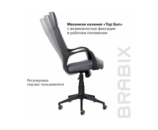 Кресло оснащено надежным механизмом "Top Gun", который позволяет регулировать высоту сиденья и усилие качания, обеспечивая максимальный комфорт. Оно выдерживает нагрузку до 120 кг, что подтверждает его надежность и долговечность. Кресло BRABIX "Prime EX-515" — это качественное и стильное решение, подходящее как для работы, так и для игр, делая его идеальным выбором для любого, кто ищет универсальное компьютерное кресло.