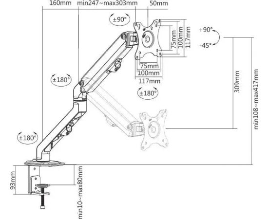 Настольный кронштейн для монитора с системой газ-лифт. Пружинный механизм позволяет легко перемещаться вверх и вниз.
