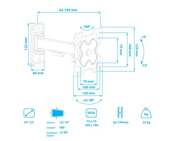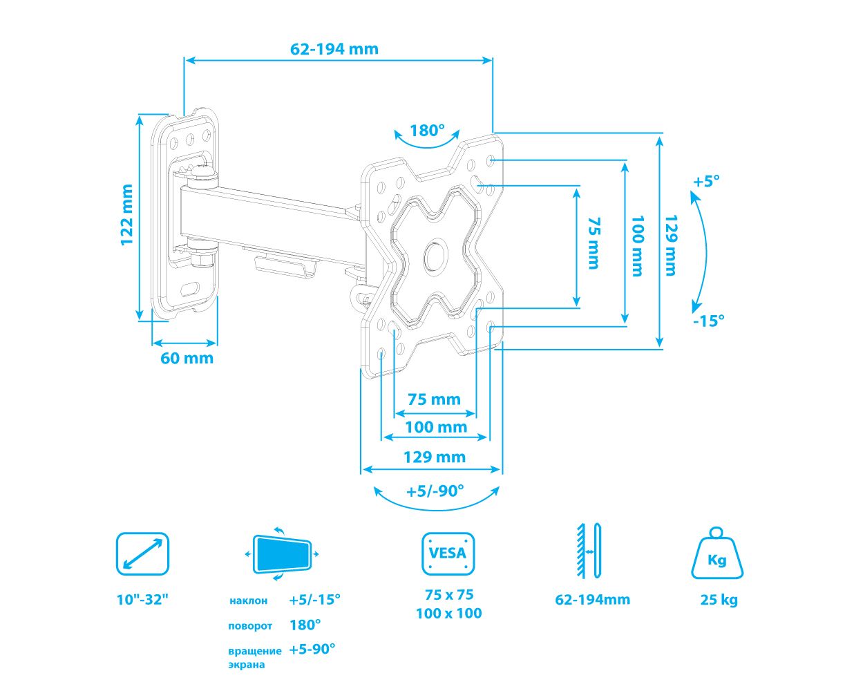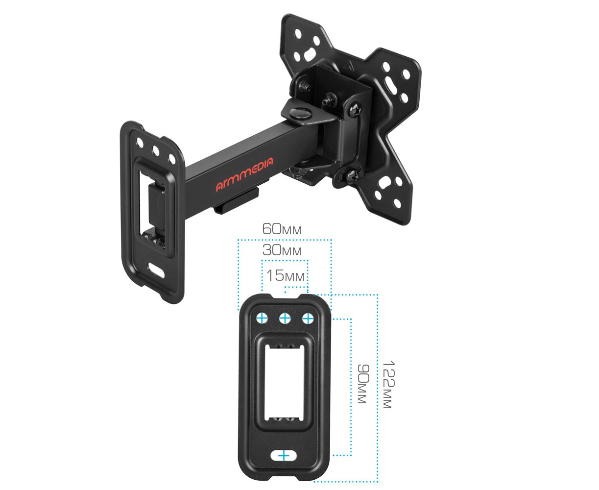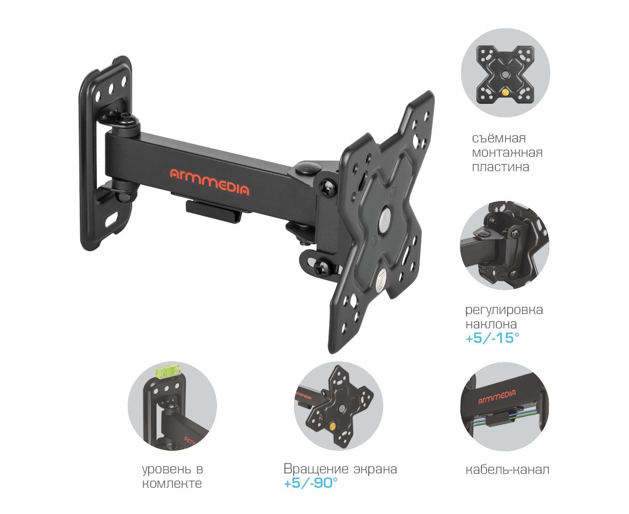 Надежная стальная конструкция, Универсальный - телевизор на кронштейне можно наклонить, повернуть и сдвинуть к стене, Легкий монтаж телевизора - благодаря наличию съемной монтажной пластины, Кабель-канал, Вращение экрана +5° -90°
