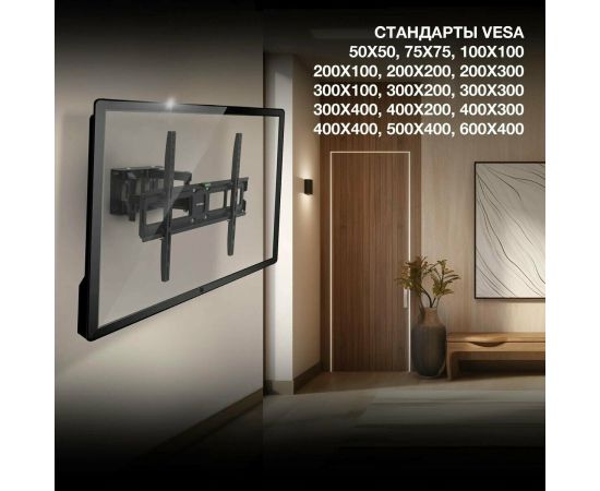 Стандарт Vesa: 50х50 мм, 75х75 мм, 100х100 мм, 100х200 мм, 200х100 мм, 200х200 мм, 200х300 мм, 300х100 мм, 300х200 мм, 400х200 мм, 300х400 мм, 400х300 мм, 400х400 мм, 500х400 мм, 600х400 мм;