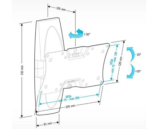 наклон, наклон и поворот, поворот, Угол наклона -20/+20,Угол поворота -50/+50
