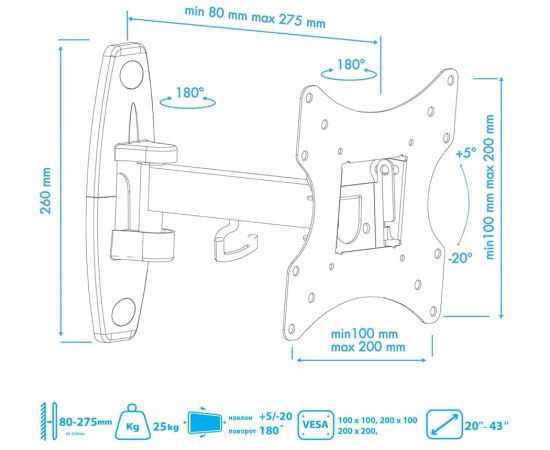 Стандарт Vesa: 100x100 мм, 200x100 мм, 200x200 мм