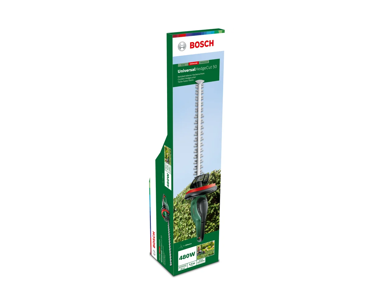 Кусторез Bosch UniversalHedgeCut 50 06008C0501 оптимально подходит для малошумной обработки высоких изгородей.