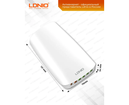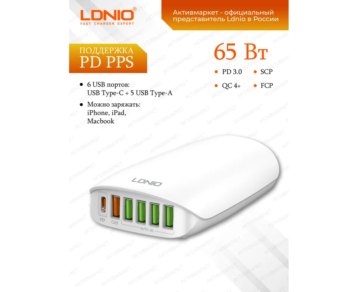 Сетевое зарядное устройство LDNIO A6573C - это стильная и качественная настольная зарядная станция для мобильных устройств. Устройство имеет шесть USB выходов: один TYPE-C с поддержкой протокола быстрой зарядки PD и пять TYPE-A: 4 USB порта (зеленого цвета) поддерживают обычную зарядку с технологией Auto ID, 1 порт (красного цвета) поддерживает функцию быстрой зарядки Quick Charge 3.0. Технология Auto-ID позволяет автоматически определять подключенное устройство и заряжать его максимальным током - это существенно сокращает время зарядки. Входное напряжение - от 100 до 240 В. Выходные параметры: PD:5V-3A,9V-3A,12V-3A ,15V-3A,20V-3.25A (65W Max), QC 3.0: 5V-3A,9V-2A,12V-1.5A (18W Max). Максимальная мощность – 65 Вт. LDNIO A6573C имеет многоуровневую систему защиты: от повышенного тока, от повышенного напряжения, от короткого замыкания, от перегрева. Корпус устройства изготовлен из высококачественного негорючего пластика (до 850 гр. C).