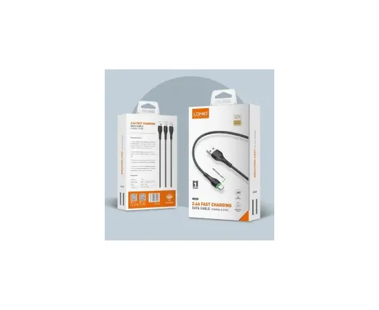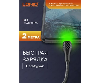Кабель LDNIO LS522/ USB + Type-C/ 2m/ 2.4A/ LED подсветка/ медь: 112 жил/ Серый