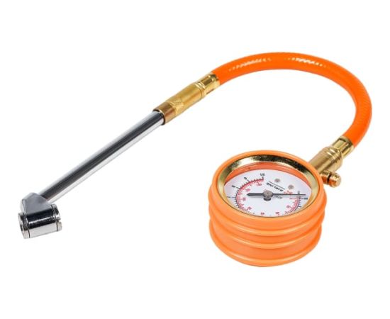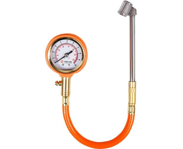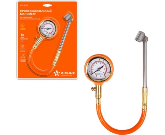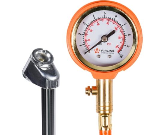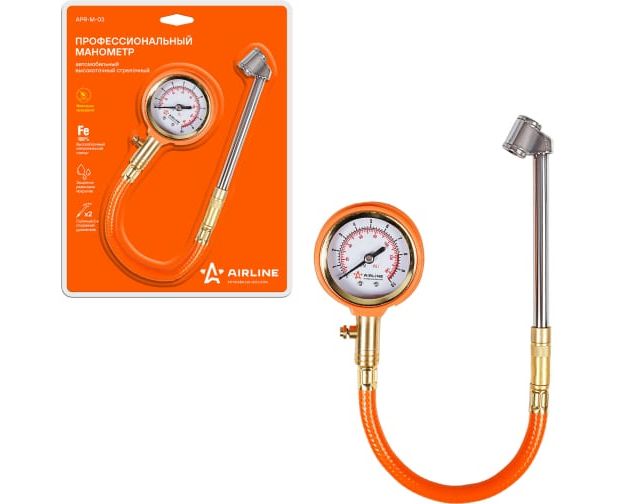 Стрелочный профессиональный манометр Airline 10 АТМ APR-M-03 используется для измерения давления в шинах автомобиля. Имеет прочный металлический корпус, гибкий шланг и удлинённую металлическую штангу.
