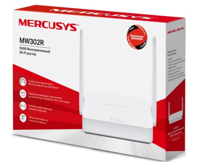 MERCUSYS MW302R Wi-Fi роутер, 2,4 ГГц, 1 порт WAN 10/100 Мбит/с и 2 порта LAN 10/100 Мбит/с, 2 внешние антенны 5 дБи, поддержка IPTV, IPv6, родительский контроль, поддержка режимов точки доступа/усили