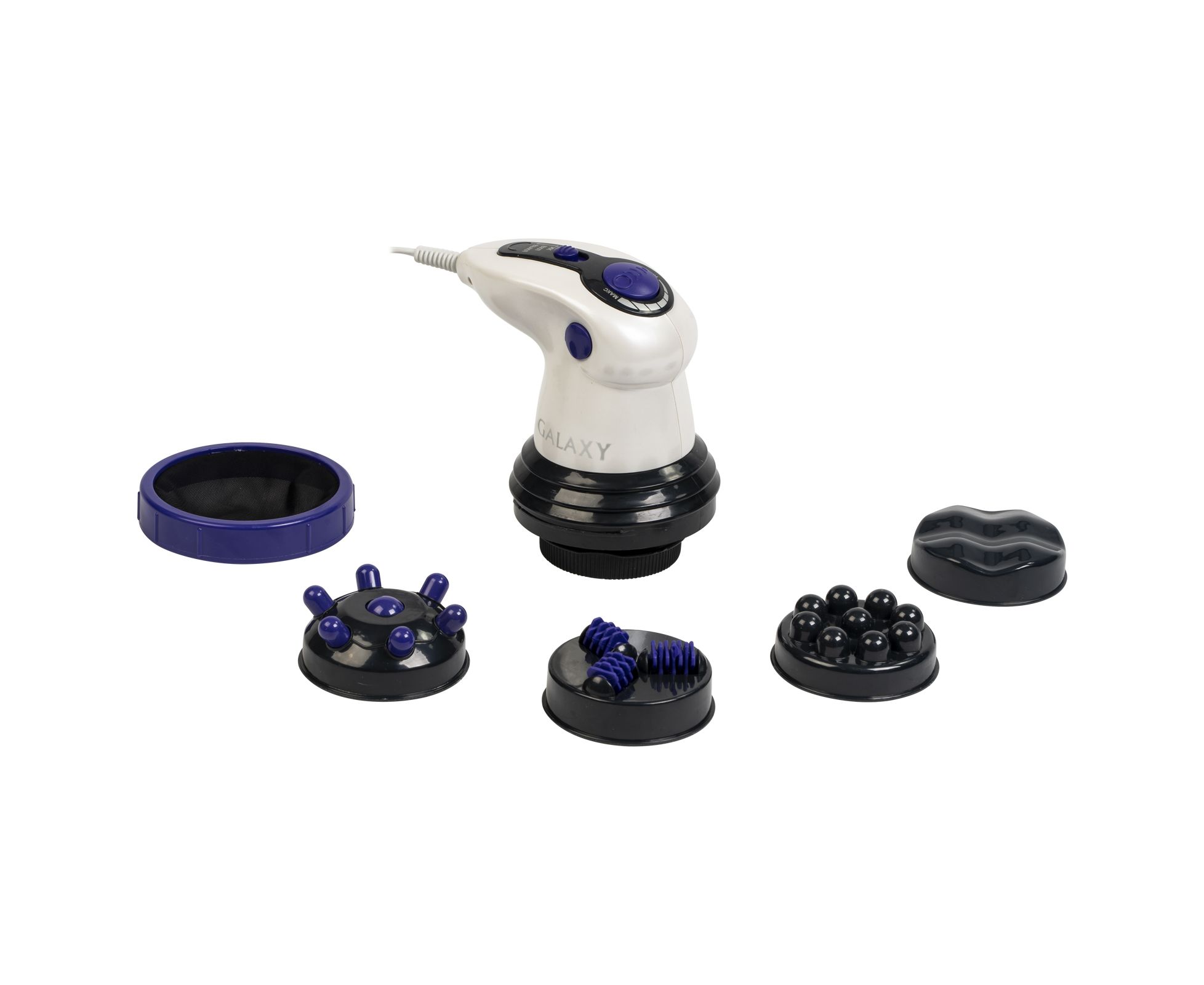 - 5 насадок: пальчиковая массажная насадка, валиковая массажная насадка, шариковая массажная насадка, волнистая массажная насадка, защитная сетчатая насадка.