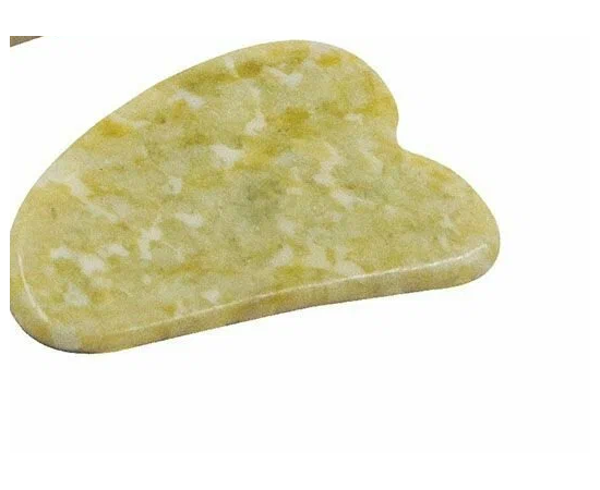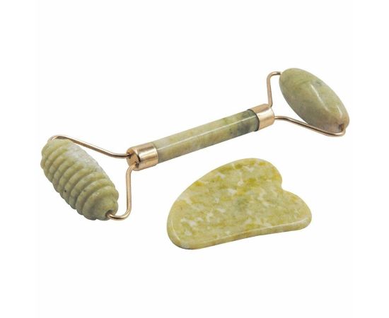 Массажный набор для лица. Материал - высококачественный натуральный камень нефрит с декором "под золото". В набор входят: двусторонний ролик - размер 15х6х4 см; скребок Гуаша - размер 7,3х5 см.