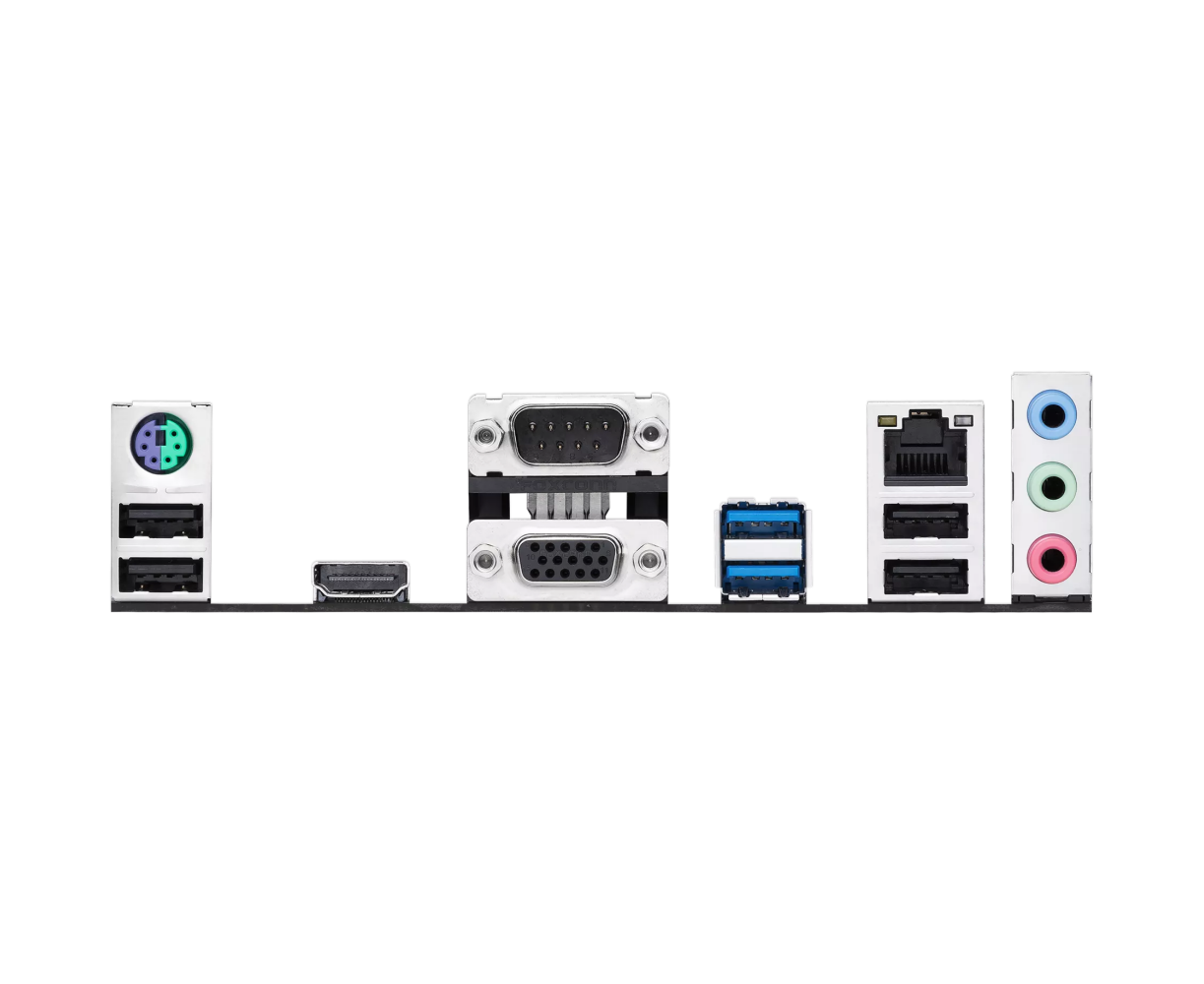 PS/2, 4 x USB 2.0, 2 x USB 3.2 Gen1, VGA, HDMI, RJ-45, COM