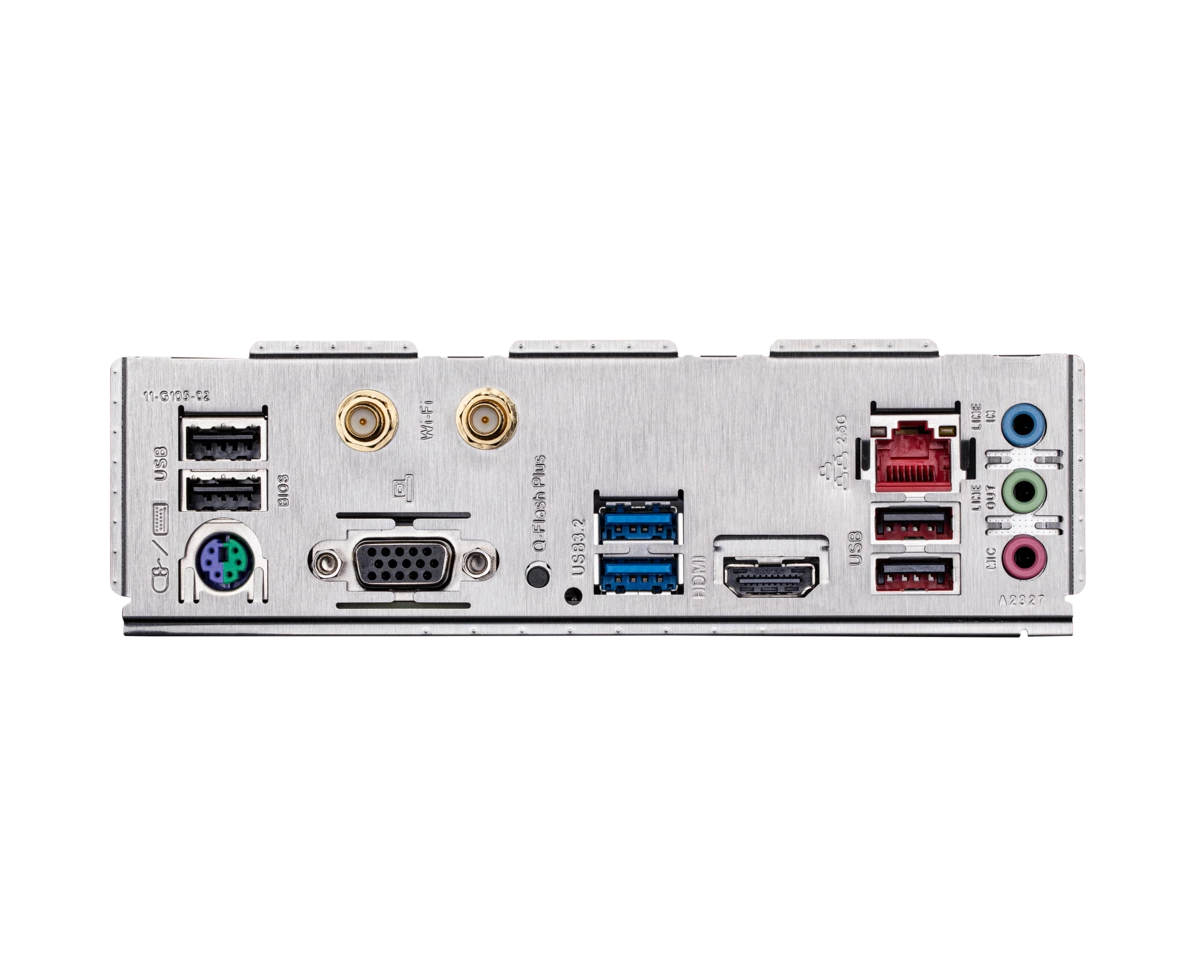 PS/2, 4 x USB 2.0, 2 x USB 3.2 Gen1, VGA, HDMI, RJ-45
