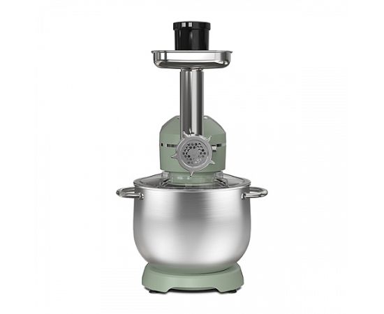 Планетарный миксер, чаша, крышка чаши, металлический венчик для взбивания, крюк для замешивания теста, насадка для смешивания, мясорубка, 3 диска для приготовления фарша, толкатель мясорубки, руководство по эксплуатации, гарантийный талон