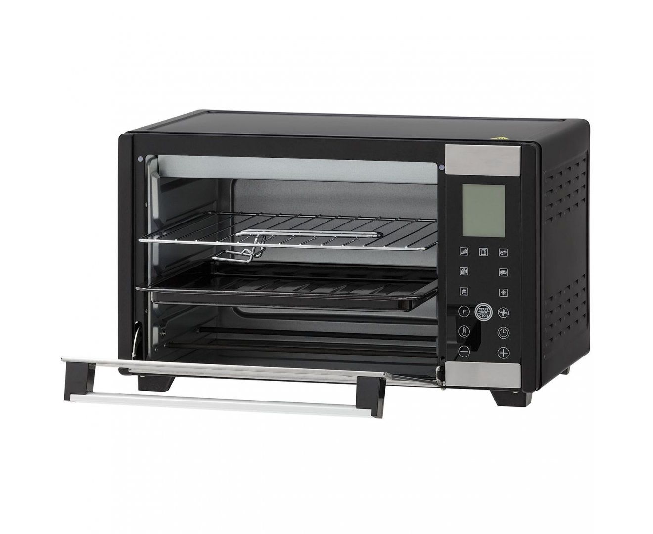 Цифровое сенсорное управление. Увеличенный объем. Противень с ручкой в комплекте. 7 автоматических программ. 6 режимов работы с конвекцией. Электронный программатор. Плавная регулировка температуры.