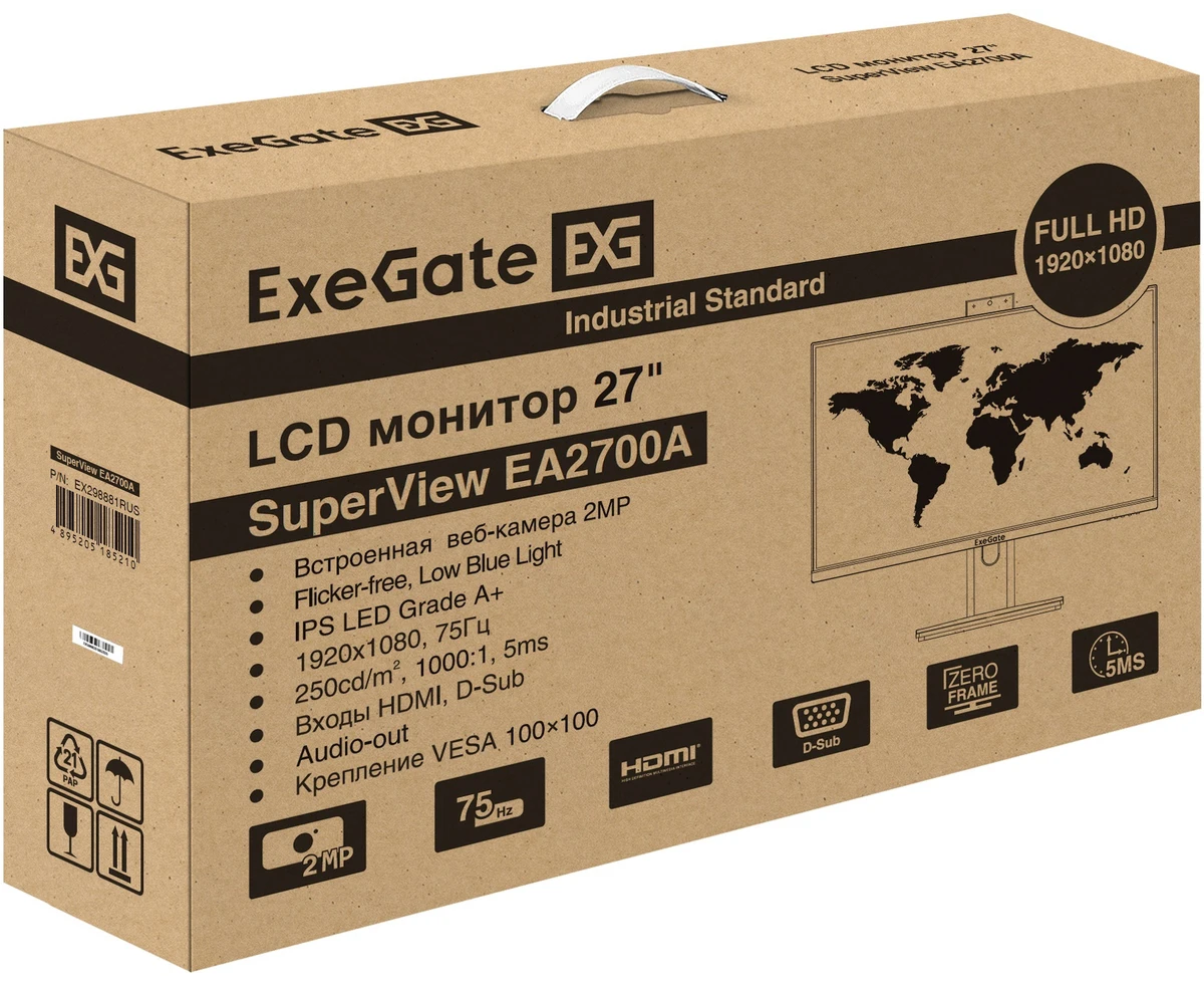 Монитор ExeGate EA2700A SuperView (EX298881RUS) IPS 1920x1080 75Hz 5ms 16:9 250cd 1000:1 178/178 D-Sub HDMI webcam AudioOut