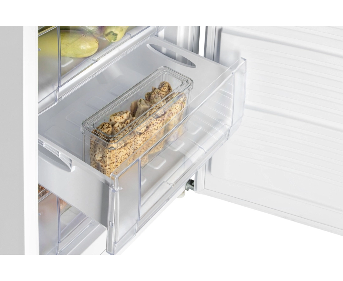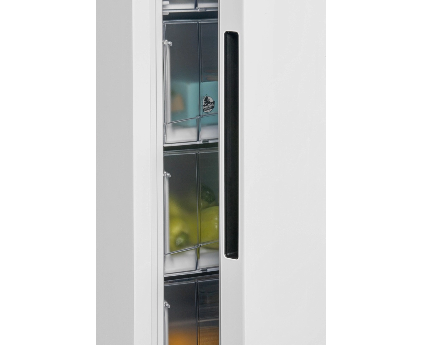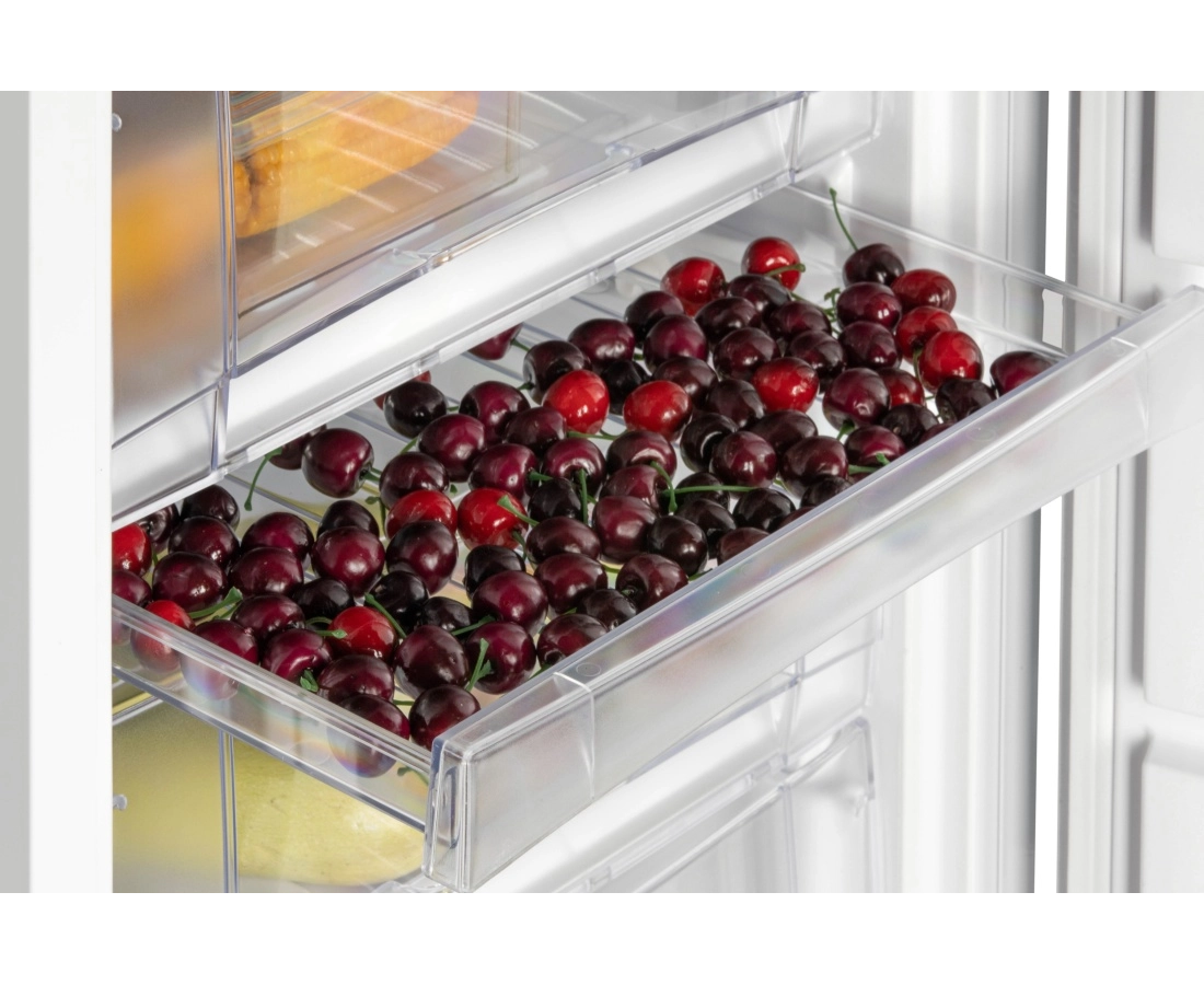 Морозильник имеет 8 секций для размещения продуктов: 6 выдвижных прозрачных ящиков и 1 отделение с откидной шторкой, лоток для ягод и форму для льда. Внутренняя поверхность модели имеет антибактериальное покрытие, которое предотвращает появление неприятных запахов и образование бактерий.