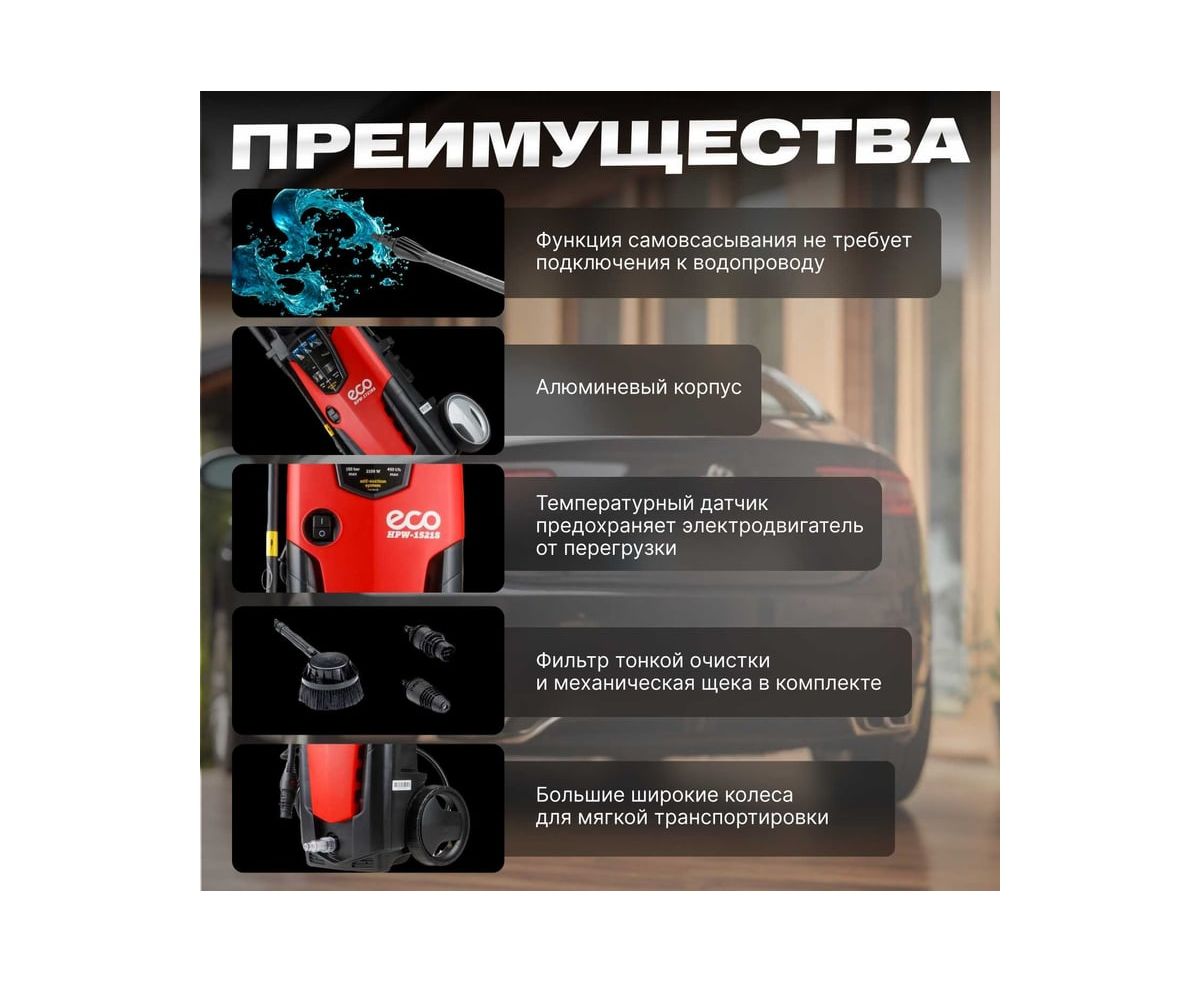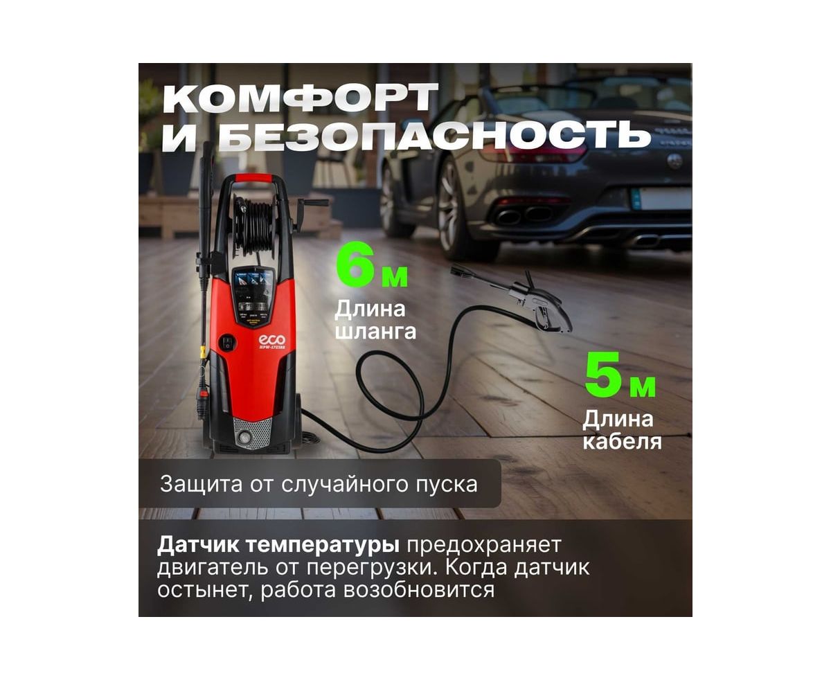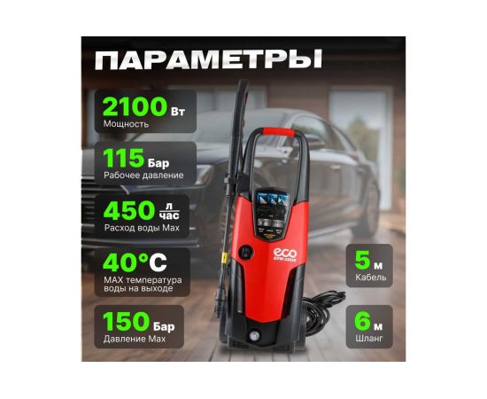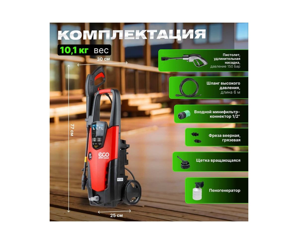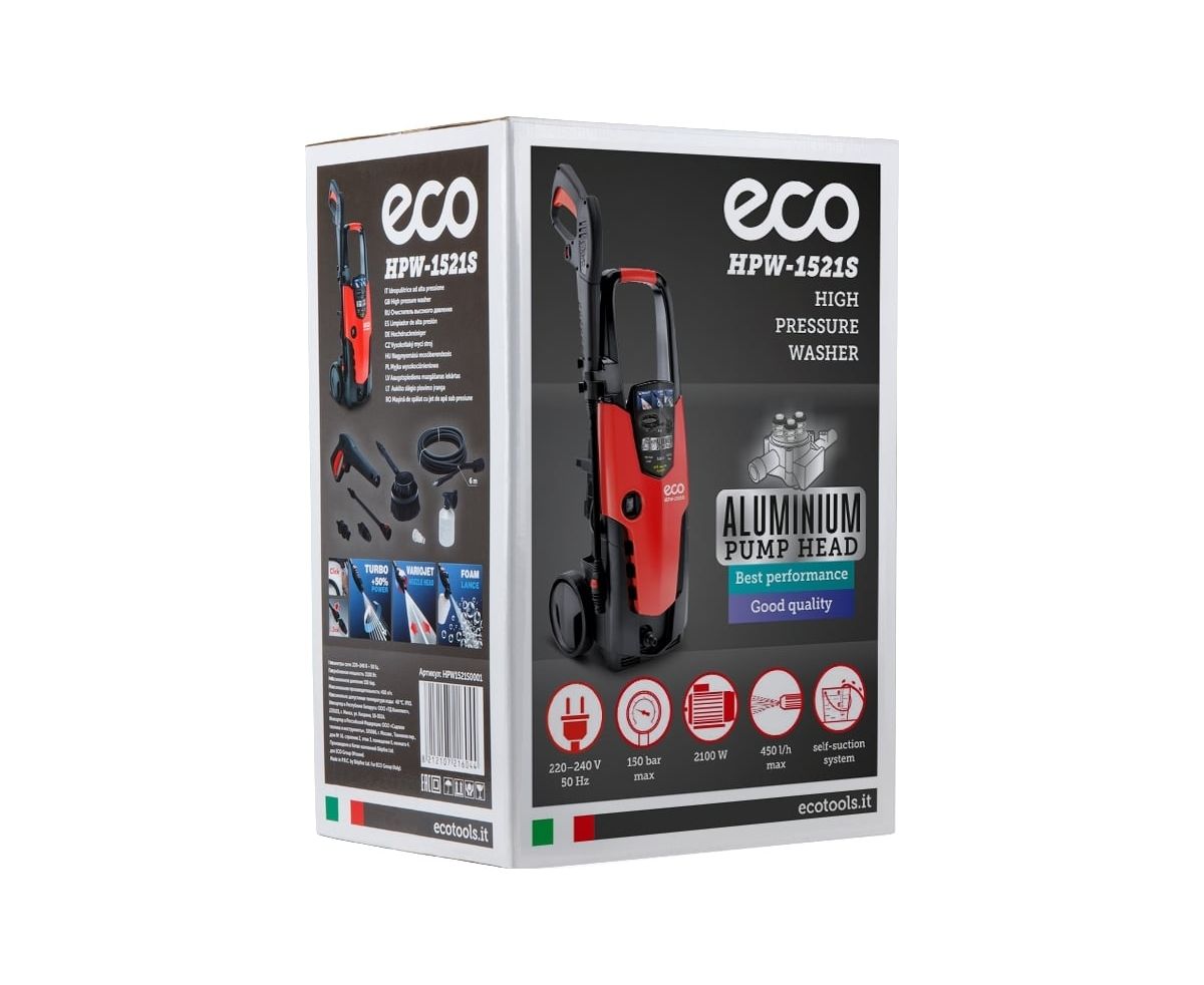 Мойка высокого давления ECO HPW1521S0001 применяется для очистки фасадов зданий, садовых дорожек и внедорожников.