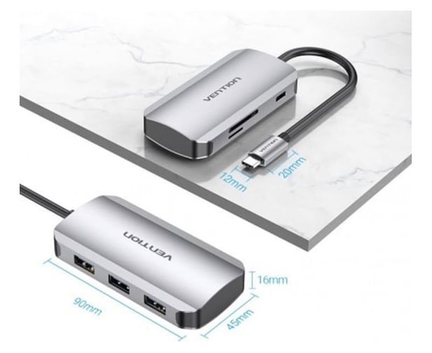 Мультифункциональный хаб VENTION USB-C > USB 3.0x3/SD/TF/PD TNHHB позволяет увеличить количество разъемов на вашем устройстве с разъемом USB Type C. Хаб оснащен разъемами для считывания карт памяти с максимальным объемом считывания карт памяти до 256 Гб. Также благодаря 3 разъемам USB 3.0, одновременно можно подключать, или заряжать до 3 устройств на оборудовании с разъемом USB Type C, а разъем USB Type C можно использовать для быстрой зарядки устройств с мощностью до 100 Ватт. Корпус из высокопрочного алюминия предает хабу презентабельный внешний вид, максимально полезный отвод избыточного тепла и обеспечит надежную защиту от внешних воздействий в процессе эксплуатации. Поддерживает стандарт USB OTG. Поддерживает технологию Plug and Play, тем самым, не требуя установки дополнительного программного обеспечения и драйверов.