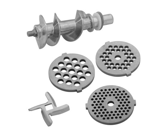 В комплект входят 3 решетки для изготовления фарша, а также специальные насадки для колбас и кеббе.