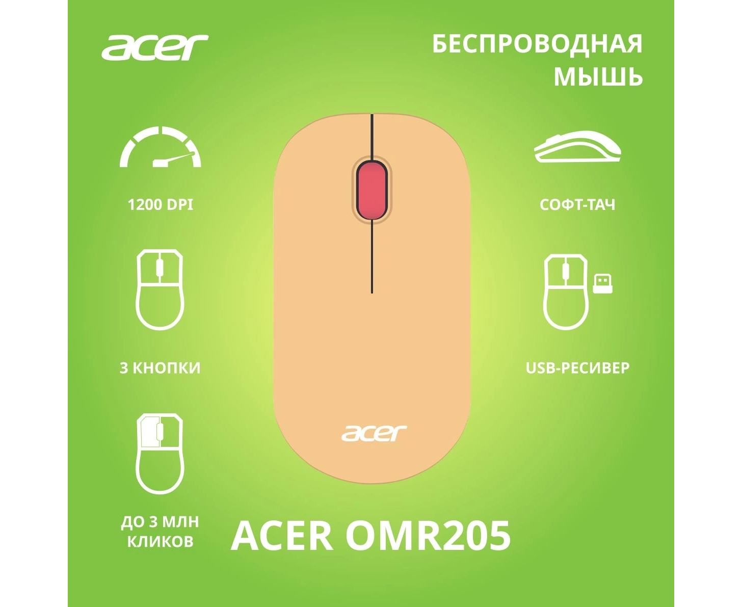 Мышь Acer OMR205 розовый/бежевый оптическая (1200dpi) беспроводная USB для ноутбука (2but)