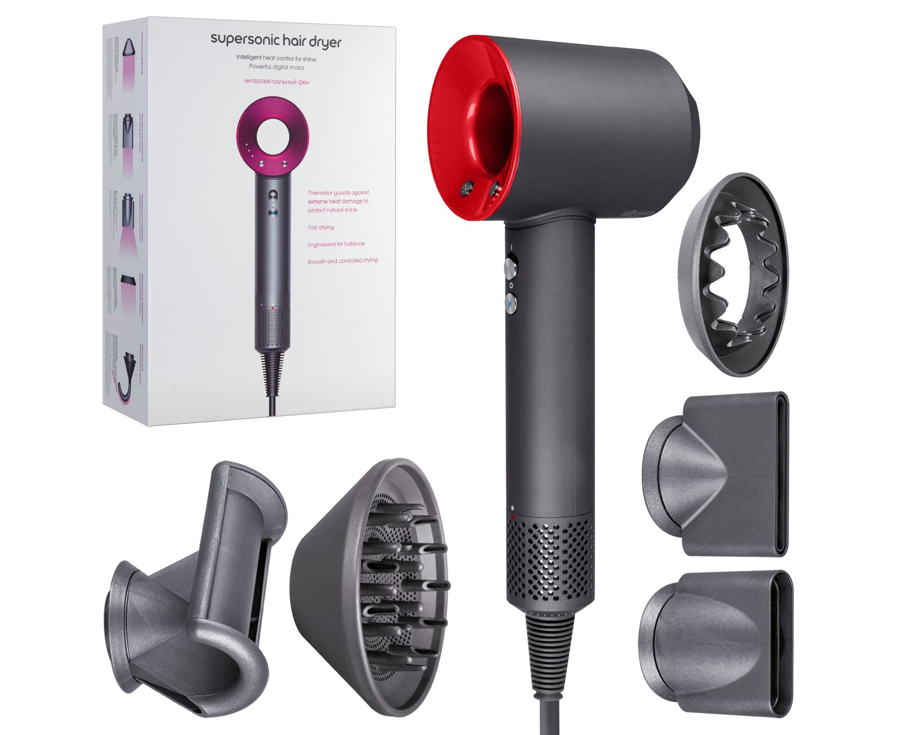 Набор фен supersonic (6 в 1) 1.8м (Серый с красным)