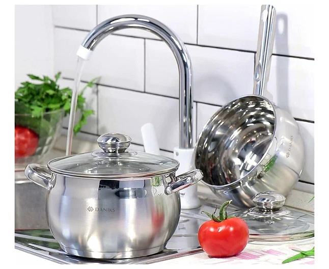 ковш 1.9 л (с крышкой), кастрюли 1.9, 2.9, 3.9, 6.5 л (с крышками), сковорода 24 см (с крышкой)
